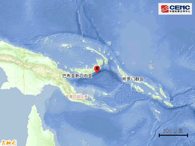 震中300公里范围内有3座大中城市,最近为金贝(Kimbe),距震中约180公里。震中5公里范围内平均海拔约-7097米。