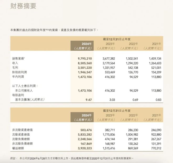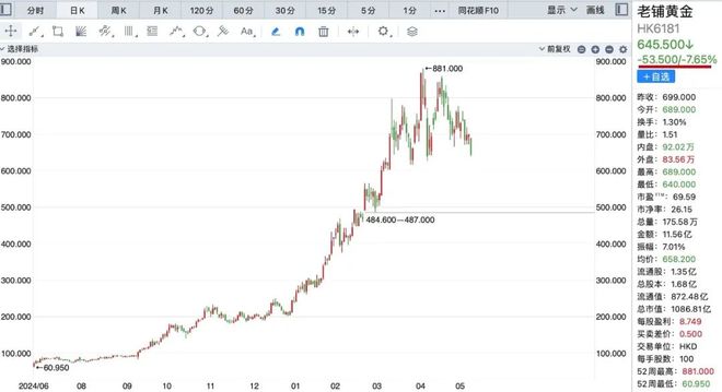 回顾老铺黄金的上市历程,可谓是一路高歌猛进。2024年6月港股上市时,全球发售及行使超额配股权的所得款项净额约为9.57亿港元。自上市以来,其股价犹如坐上火箭,较40.5港元/股的发行价最高上涨超过20倍,在今年4月2日一度达到881港元/股。截至5月12日下午收盘,老铺黄金报收645.50港元/股,日跌幅7.65%,总市值高达1086.81亿港元。整体亮眼的股价表现背后,是其出色的业绩支撑。2024年,尽管消费市场充满不确定性,老铺黄金却逆势上扬,多地门店大排长龙,业绩与股价齐飞。财报显示,2024年其营收同比大涨167.5%至85.06亿元;净利润增长253.9%至14.73亿元。更令人惊叹的是,这一成绩仅由36家自营门店及线上渠道销售构成,平均每家门店店效高达3亿元。