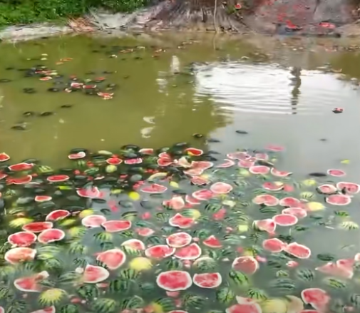 广西扶绥县瓜农因收购价低把西瓜扔鱼塘喂鱼或烂地里,当地:已发起爱心帮扶。