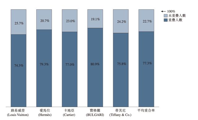 在财报中,老铺黄金援引弗若斯特沙利文调研资料称,其消费者与路易威登、爱马仕、卡地亚、宝格丽等国际五大奢侈品牌的消费者平均重合率高达77.3%,具备高端消费特点,验证了品牌的高端定位。