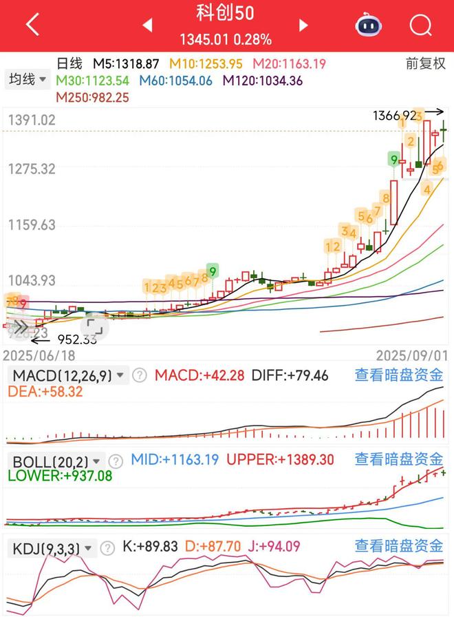 :8月科创板整体表现亮眼,科创50指数单月涨幅近三成,创下近三年新高,从市场格局看,AI硬件、创新药械等产业主线持续发酵,带动板块估值中枢上移。当前市场资金更倾向于选择具备技术壁垒和业绩兑现能力的标的,尤其是那些能受益于国产替代和产业升级的细分领域。技术面上,科创50近期呈现多头排列,中期均线稳步上移,布林通道中轨持续抬升,说明市场对科技成长主线的信心并未动摇,不过短期指标已显超买,近期震荡回落释放了部分获利盘压力,这种调整反而为后续行情提供了更健康的起点。