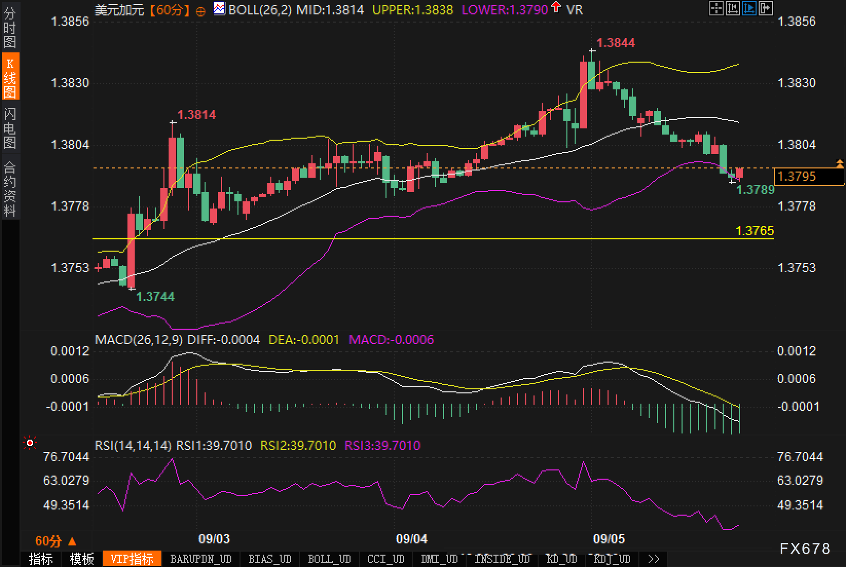 阻力方面,依次为1.3814(布林中轨/前高共振)、1.3838(布林上轨)与1.3844(阶段高点);支撑方面,先看1.3790(布林下轨)与1.3789邻近价,其下为1.3765与1.3744的静态阶梯。整体而言,小时级别从前期上升通道切换为高位振荡偏弱,短线仍以区间内的均值回归与轨道边缘的博弈为主。
