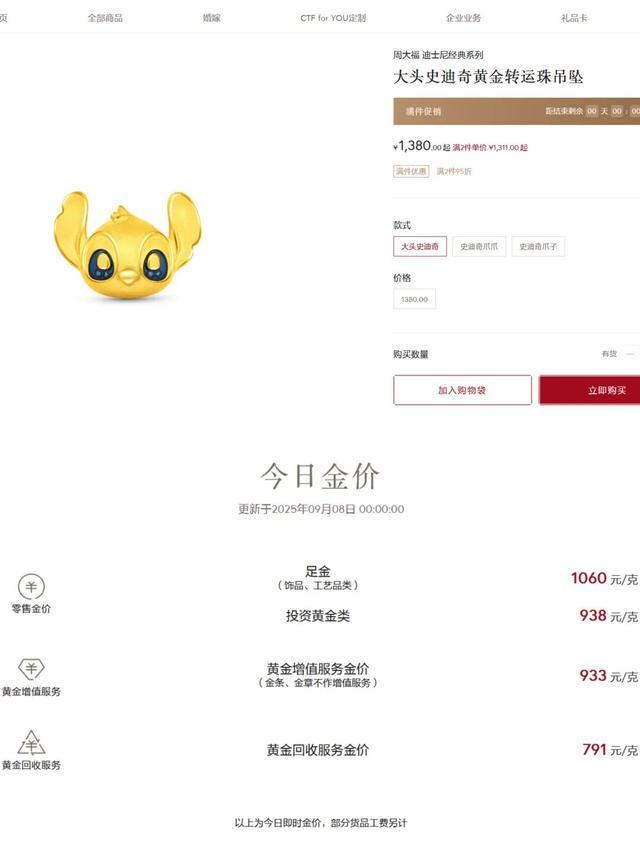 “大头史迪奇黄金转运珠吊坠是一口价,现在价格是1380元,重量为0.5克,店里有活动打完折是1311元。”周大福一门店销售人员介绍道。