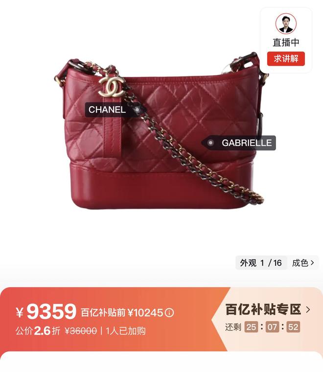 一只专柜售价36000元的香奈儿流浪包,在二奢电商平台上,售价不仅打了“骨”折,还送上百亿补贴活动以及满8999减300元的优惠,最终售价为9359元,是专柜价的2.6折。