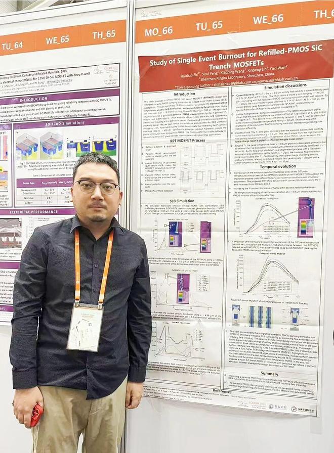深圳平湖实验室第三代跃升课题组展示了1项成果(1篇墙报),报告作者为支海朝博士。研究内容基于已授权中国专利(CN118352396B)以及已公开的中国专利申请(CN119767744A),报告讨论基于碳化硅外延回填工艺,全flow无需离子注入即可实现具有侧壁寄生p-MOS 的碳化硅沟槽栅MOSFET器件。通过单粒子辐照TCADAG真人网站仿真,证实该MOSFET结构具有高抗单粒子辐照特性。报告获得较多与会专家关注,支海朝博士与AIST、SUNY Albany、Fraunhofer IISB、ST、U of Warwick、centrotherm、三安AG真人网站等学校和公司专家就相关内容进行深入讲解与交流。