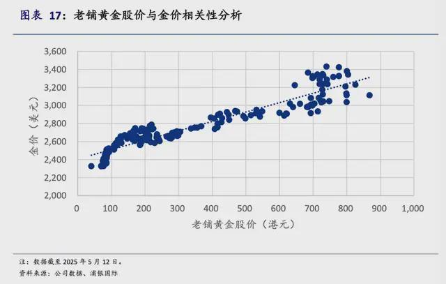 老铺黄金这种商业模式的不确定性,也反映在公司的估值逻辑上,根据浦银国际的研究,老铺的股价与金价之间具有非常高的相关性。