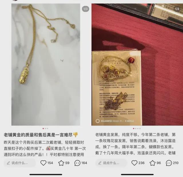 尽管老铺黄金表示会坚持原创设计和产品迭代,但背后频繁出现的质量问题,以及一直被诟病的代工模式,似乎都与品牌宣传的“手工匠心”模式严重背离。在社交媒体上,不少用户投诉老铺黄金的产品出现生锈变色、变形、掉钻等问题。