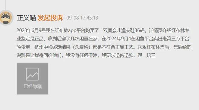 一是假货,有消费者在2023年6月购买一双36码香奈儿渔夫鞋,红布林声称经鉴定师鉴定该鞋为正品,但是今年9月该名消费者在闲鱼上专卖时,杭州中检的初检复检结果均显示,该香奈儿渔夫鞋不符合正品工艺,为假货,要求红布林假一赔三。
