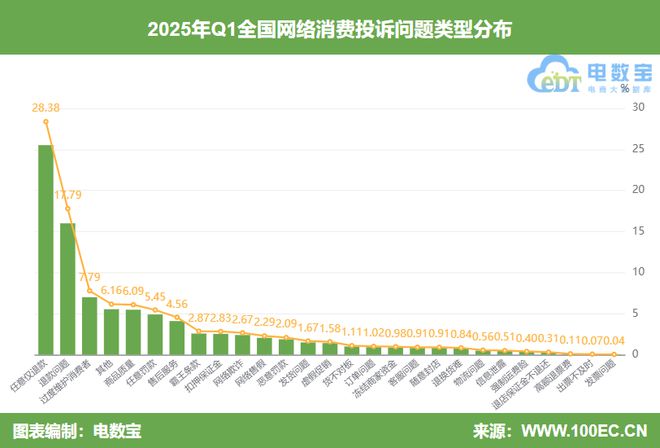 据“电诉宝”显示,2025年Q1全国网络消费投诉问题类型TOP10中,任意仅退款占比高达28.38%,其余问题类型依次为:退款问题(17.79%)、过度维护消费者(7.79%)、商品质量(6.09%)、任意罚款(5.45%)、售后服务(4.56%)、霸王条款(2.87%)、扣押保证金(2.83%)、网络欺诈(2.67%)、网络售假(2.29%)。