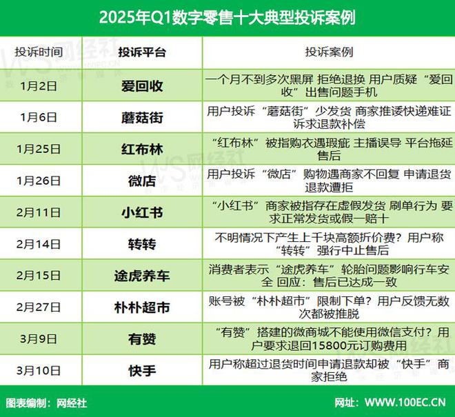 2025年4月2日,网经社电子商务研究中心发布了《2025年Q1中国电子商务用户体验与投诉数据报告》。报告涉及了数字零售(主要集中在二手电商、电商服务商)、数字生活(主要集中于生活服务电商、在线旅游)及数字教育、产业电AG真人商、金融科技、物流科技等领域。报告公布了2025年Q1网络消费投诉数据及《数字零售十大典型投诉案例》《数字生活十大典型投诉案例》和《数字教育十大典型投诉案例》。