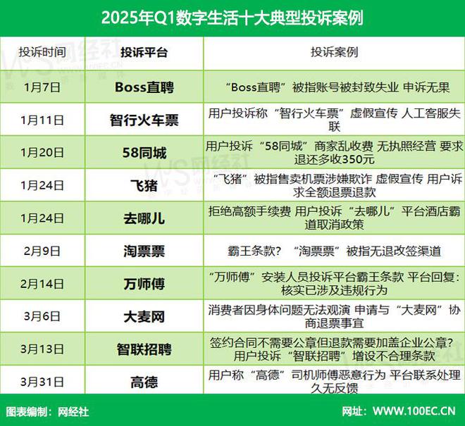 在数字生活消费领域,据“电诉宝”受理用户维权案例,我们从中选取十大典型投诉案例,涉及Boss直聘、智行火车票、58同城、飞猪、去哪儿、淘票票、万师傅、大麦网、智联招聘、高德。