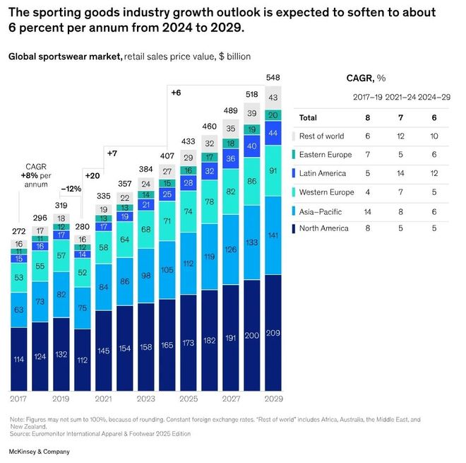 麦肯锡数据显示,2021–2024年北美和西欧户外运动服饰市场年均增速约5% 和7%;而展望2024–2029 年,西欧的增速将放缓至5%,北美也趋于停滞。与之对应的,亚太地区经历了2021到2024年的狂飙后,虽放缓至6%,但由于综合体量大,仍是高端品牌寻找新增量的首选市场。