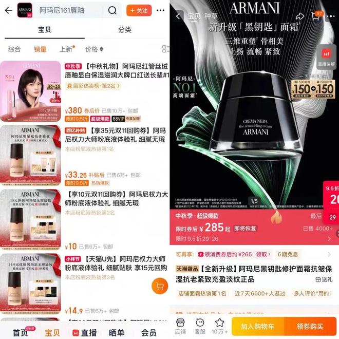 以中国市场为例,阿玛尼美妆自2006年进入中国后,便通过设立直营专柜强化高端消费体验,以此逐步渗透线年,阿玛尼正式入驻天猫开设旗舰店,首日业绩便达1700万元。自此,阿玛尼美妆加速推进数字化转型,依托“线上+线下”双轨并行的发展模式,进一步推动中国市场成为其核心增长引擎。