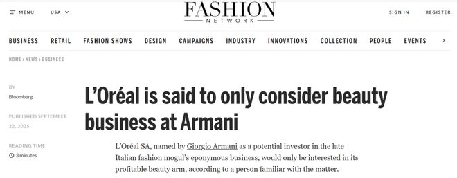 而欧莱雅计划收购阿玛尼也与乔治·阿玛尼的遗嘱有关。其在遗嘱公开透露,其继承人必须将阿玛尼集团15%股份出售给其他奢侈品/美妆公司,或进行首次公开募股。