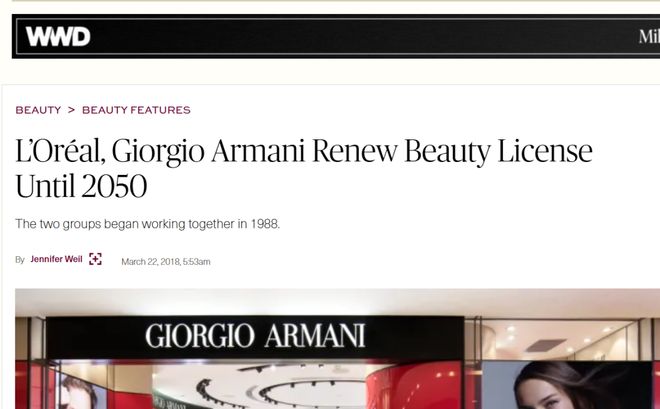 同时,值得一提的是,据WWD在2018年报道,欧莱雅目前与阿玛尼的美容许可证已续签至2050年。