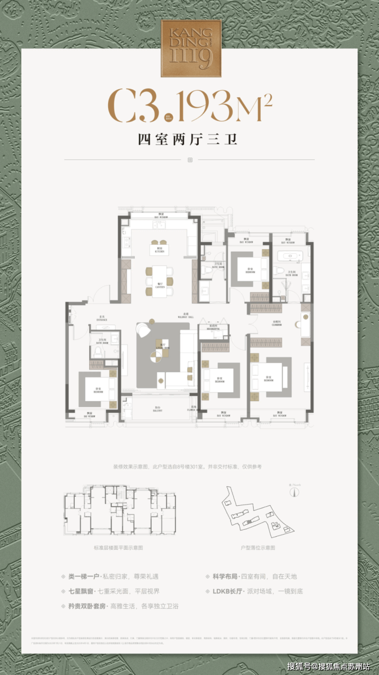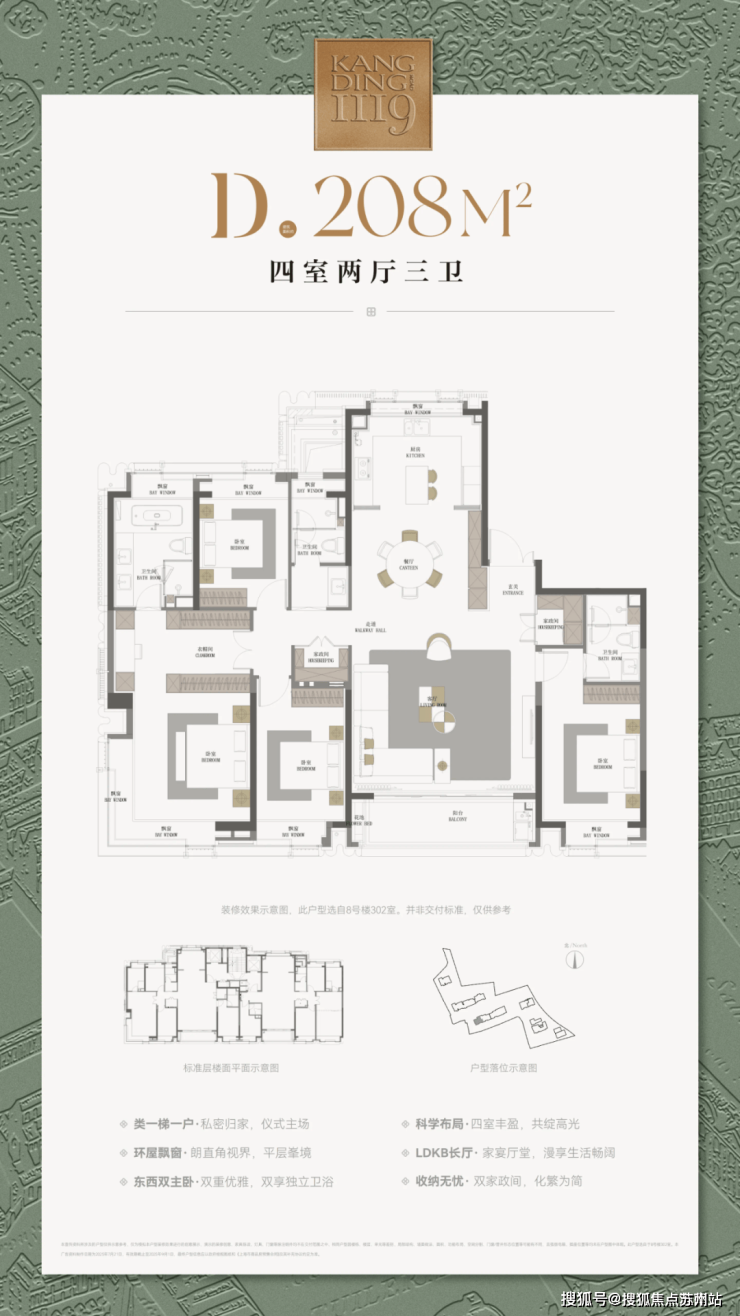 以建面约193户型为例,卫浴设备采用国际品牌如唯宝、高仪、卡德维等,厨电品牌采用嘉格纳,全套配置油烟机、灶台、洗碗机、双开门冰箱、蒸烤一体机等,同时装配德国美诺洗衣机烘干机套装。