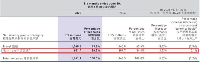 比如:2025上半年,新秀丽子品牌TUMI在亚洲和北美洲的销售净额分别下降2.5%和4.7%;另一子品牌AmericanTourister在亚洲市场下降14.1%,北美市场暴跌20.9%!