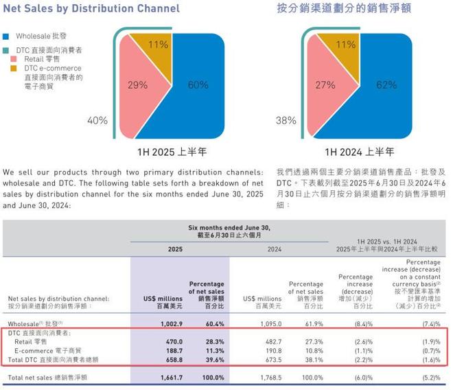 2025上半年,DTC渠道的销售净额从38.1%上升到39.6%,上升了150个基点。