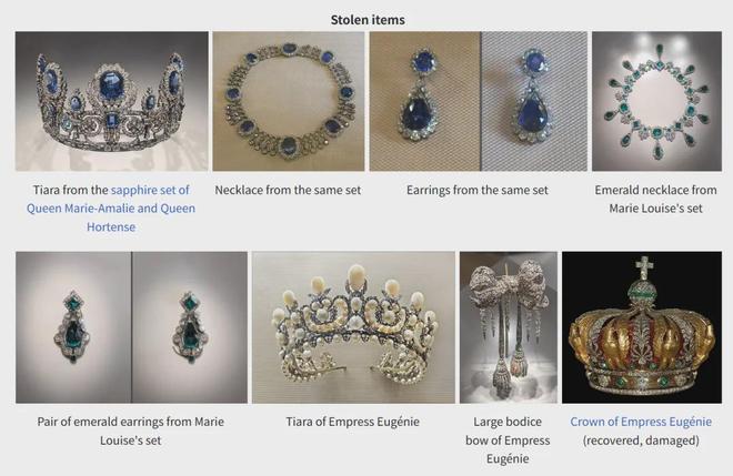 本次卢浮宫总共被偷走了八件珍贵珠宝,包括一顶皇家蓝宝石冠冕和一套皇家祖母绿项链配耳环,业内人士估计这些失窃物品总价高达8800万欧元,约7.2亿人民币,堪称天价。