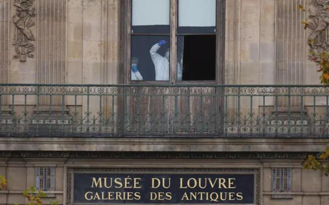 他们伪装成建筑工人,身披黄色反光背心,还贴心地摆放了交通锥,然后其中两名窃贼利用卡车上的电动梯登上了卢浮宫塞纳河一侧的阳台,并用圆盘切割机切开玻璃窗,进入到博物馆内部。