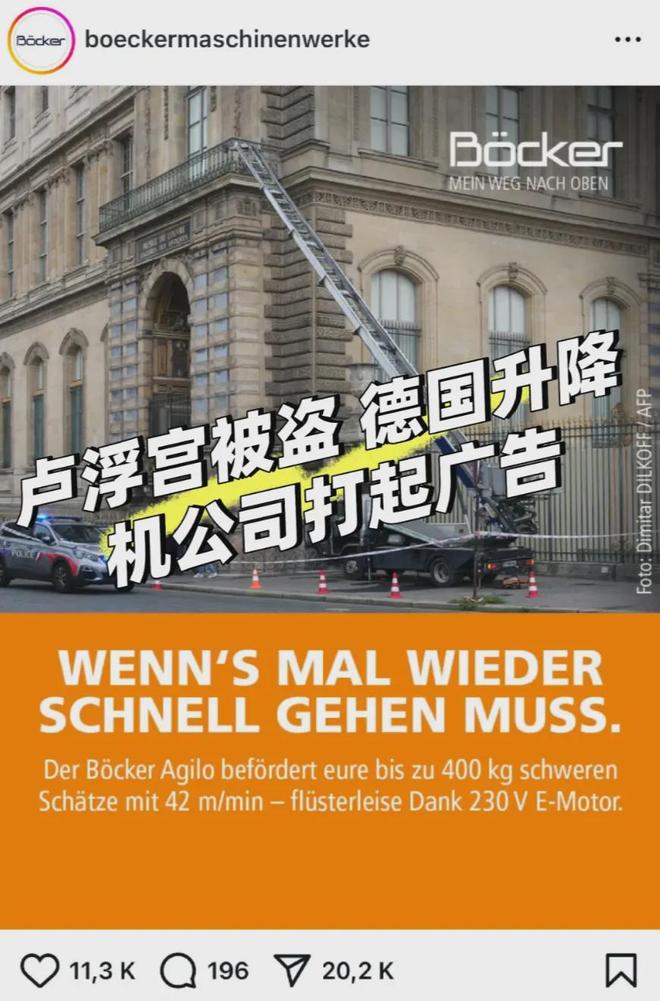 因为该品牌发现,卢浮宫盗贼使用了它们家的产品,于是给案发现场照片加上了宣传语:“Böcker Agilo 能以每分钟 42 米的速度、几乎无声地运输你们重达400公斤的宝贝,而这一切都要归功于它的230伏电动马达”。