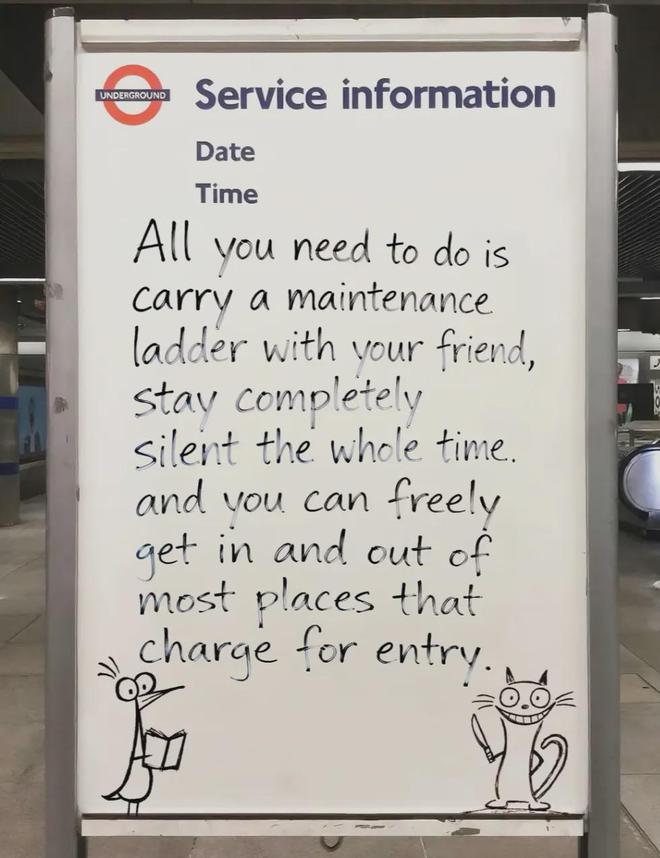 的英国,事发没多久就在地铁告示栏上写了小作文:“你只需要和你朋友带一个维修梯,全程保持安静,这样就能免费去到绝大多数要收费的地方了”。道理咱们都懂,但你说要收费的地方,也包括卢浮宫对吧?