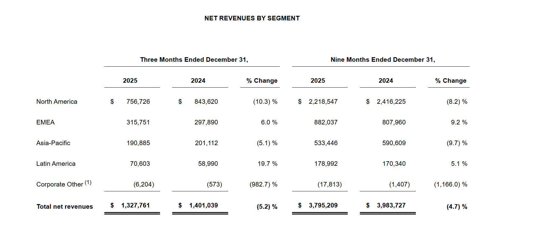 区域表现方面,作为公司最大市场的北美地区持续承压,销售额同比下降10%至7.57亿美元;国际业务收入则同比增长3%至5.77亿美元,其中拉丁美洲销售额飙升20%,欧洲、中东和非洲地区(EMEA)增长6%,而亚太地区销售额下降5%。渠道与品类表现上,批发收入同比下降6%至6.6亿美元;直接面向消费者(DTC)的销售额整体下降4%至6.47亿美元,其中安德玛自有运营门店收入下降2%,电子商务收入下降7%。品类方面,服装收入下降3%至9.34亿美元,鞋类收入下降12%至2.65亿美元,配饰收入下降3%至1.08亿美元。
